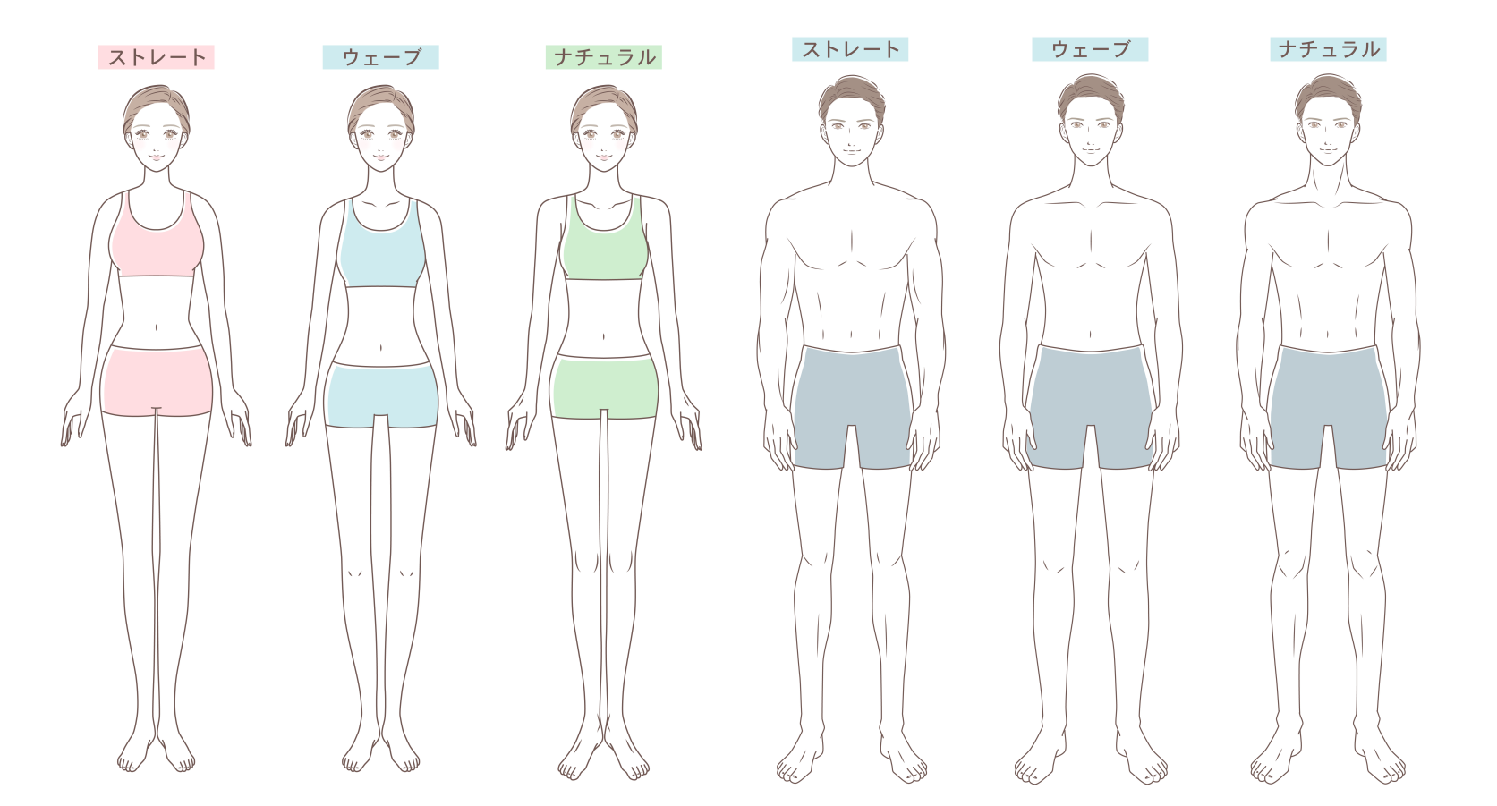 「骨格タイプ」は男性・女性共に「ストレート」「ウェーブ」「ナチュラル」の3タイプがあります。